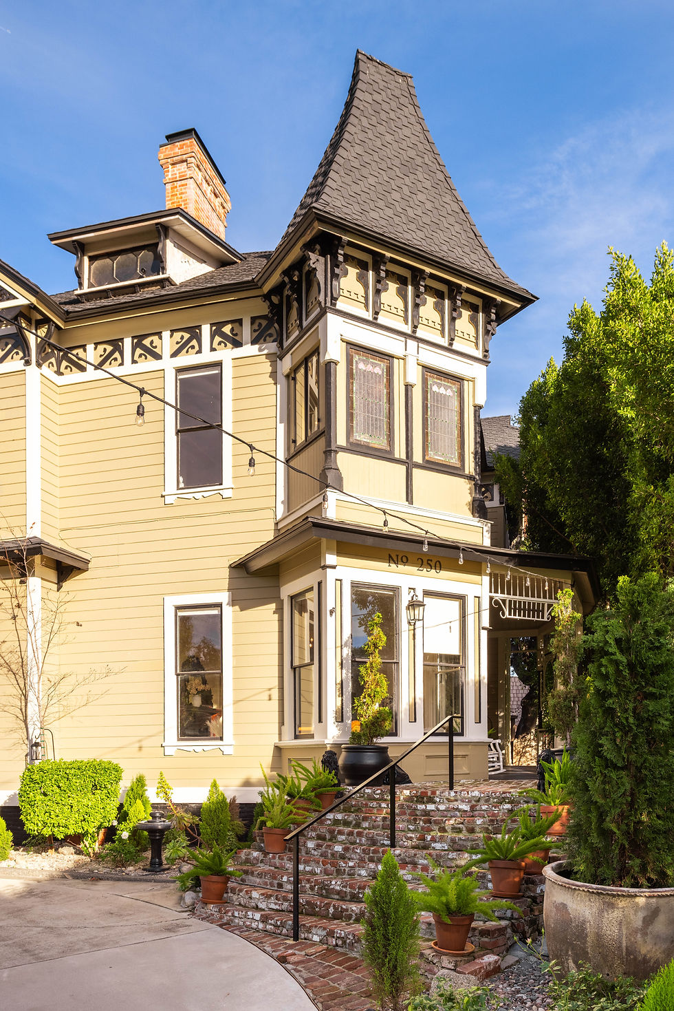 Step into a living legacy with "The Oaks," an extraordinary Southern California landmark that seamlessly marries meticulously restored Victorian grandeur with sophisticated farmhouse aesthetics. This rare offering presents a unique opportunity for stewardship, benefiting from a substantial property tax reduction of approximately 75%. Set behind a lush privacy hedge and finished entirely in rare, old-growth redwood, the residence unfolds across sixteen elegant rooms, many boasting soaring twelve-foot ceilings and five decorative fireplaces that anchor the home’s historic soul. Visitors are welcomed through double doors with frosted panes onto a magnificent veranda, leading into a grand entrance hall where a stately fireplace serves as a centerpiece for the formal sitting area. The main level is designed for both grand-scale entertaining and intimate living. An expansive living room flows effortlessly into a sun-drenched parlor, while the private dining room evokes a bygone era of elegance with its original china cabinet and integrated dumbwaiter. The service wing houses a modern culinary suite featuring a 48" Monogram stove, side-by-side refrigeration, and a spacious pantry, alongside an office and a dedicated service porch. For added convenience, the main floor includes a luxurious en-suite bedroom featuring an updated bathroom with a dual-sink vanity and custom tiled shower. Architectural artistry reaches its pinnacle at the staircase, where a newel post surmounted by a lamp-lit sculpture enchantingly evokes the fairy queen from Shakespeare’s A Midsummer Night’s Dream. The upper level reveals a spacious landing and sitting area, four generous bedrooms, a trunk room plumbed for future expansion, and a versatile den ideal for a private library. Modern infrastructure provides peace of mind, including a 50-year Presidential roof, dual-zoned HVAC, copper plumbing, and gleaming hardwood floors. Outside, the grounds are a sanctuary of tranquility, featuring garden fountains, a sprawling rear patio perfect for a future pool, and a circular driveway leading to a detached two-car garage. Located just moments from the vibrant boutiques and dining of Myrtle Avenue, this is more than a home—it is a timeless work of art